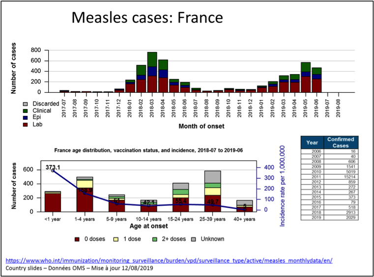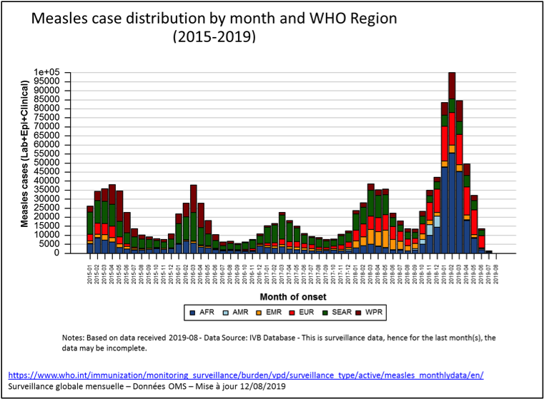 Résurgence de la rougeole : du 1er janvier au 31 juillet 2019, 364 808 cas ont été enregistrés par l’OMS, contre 129 239 en 2018 sur la même période. Les chiffres 2019 sont les plus élevés depuis 2006. Un certain nombre de pays ont perdu leur statut de pays ayant éliminé la rougeole (US, UK). Dans la zone Afrique, la seule RDC comptabilise en 2019 155 460 cas de rougeole avec un taux de mortalité de 2% (2 953 décès).