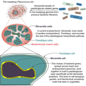 Le peptidoglycane est un composant caractéristique de la paroi bactérienne impliqué dans la division et assurant le maintien de l’intégrité cellulaire. La cochenille farineuse du citronnier, Planococcus citri, est bien connue pour héberger une structure endosymbiotique imbriquée de bactéries : la bactérie Moranella endobia (Moranella) vit dans le cytoplasme d’une autre bactérie Tremblaya princeps (Tremblaya). Il vient d’être démontré l’existence d’un transfert horizontal de gènes ayant permis à la cochenille d’acquérir certains gènes de Moranella. En effet, une protéine de la colchenille prouvée d’origine bactérienne en provenance des Moranella permet de produire une couche de peptidoglycane exclusivement autour des Moranella incluses dans les Tremblaya. Une véritable symbiose entre ces trois-là !