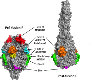 Figure 1 : Structures et sites antigéniques de la protéine F sur RSV en conformation pré- et post-fusion Représentation de la surface de la protéine F trimérique en conformation pré- et post-fusion en gris. Les sites antigéniques sont colorés et indiqués sur la figure. Les anticorps ciblant la protéine F testés chez l’être humain pour l’immunoprophylaxie des infections par le RSV sont indiqués en gras italique sous les épitopes ciblés. Figure modifiée à partir de Flynn et al, 2016 ; doi.org/10.1371/journal.pone.0164789 (Flynn et al., 2016).
