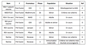Le développement de vaccins contre le RSV ou d’anticorps permettant une immunisation passive rencontre plusieurs problèmes. Tout d’abord, les résultats désastreux du premier essai réalisé dans les années 60 ont considérablement freiné les essais ultérieurs. En effet, lors de cet essai 80% des enfants qui avaient reçu le vaccin inactivé ont été hospitalisés lors de l’infection naturelle par le RSV et 2 d’entre eux (10%) sont décédés. De plus l’infection naturelle est peu protectrice, induisant au mieux une immunité transitoire (même si les bronchiolites sévères sont généralement observées lors de la primo-infection). Enfin, les corrélats de protection restent mal définis (même si la réponse cellulaire, les taux de séroneutralisation et d’IgA sécrétoires ont été corrélés à la sévérité des infections). Les premiers vaccins développés furent des vaccins vivants atténués qui, a priori, ne risquaient pas d’induire de réponse délétère chez les enfants vaccinés. Ainsi, des virus atténués par passage puis par modification génétique ciblée lors de la mise au point des méthodes de génétique inverse ont été évalués chez l’enfant. Ils n’ont pas encore permis de trouver le bon compromis entre immunogénicité et innocuité. Six d’entre eux sont aujourd’hui en phase 1 chez l’enfant. A partir des années 2000, des stratégies de vaccins sous-unitaires reposant majoritairement sur l’utilisation de la protéine F purifiée comme antigène se sont développées. Au cours des 10 dernières années, 9 candidats sous unitaires ont été testés en phase clinique. La grande majorité reposant sur l’utilisation de la protéine F comme antigène (7 sur 9). Ils sont détaillés dans le tableau 1.