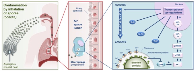 Nous souhaitons ce mois-ci mettre en avant un article très intéressant à la frontière de la biochimie, de la biologie cellulaire, de l’immunologie et de la microbiologie qui a été publié récemment dans Nature Communications. Cette publication du groupe de recherche de Cristina Cunha et Agostinho Carvalho (Institut de recherche en sciences de la vie et de la santé (ICVS), École de médecine, Université du Minho, Braga, Portugal) présente des avancées majeures concernant la capacité de la mélanine présente à la surface des spores d’Aspergillus à réguler le métabolisme des macrophages pulmonaires.