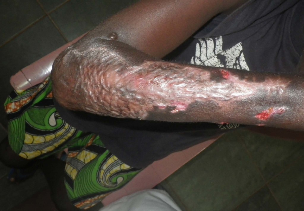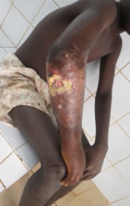 Le traitement préconisé par l’OMS consiste en une bi-thérapie antibiotique associant rifampicine (10mg/kg, 1X/j) et clarithromycine (7,5 mg/kg, 2x/j) durant 8 semaines. Le caractère indolore de la maladie dû à la production de la toxine, l’absence de fièvre, mais également l’éloignement des centres médicaux ainsi que le coût des soins expliquent la consultation encore souvent trop tardive des patients auprès du personnel médical. De ce fait, en plus de l’antibiothérapie, le recours à la chirurgie, fréquemment délabrante, reste indispensable. A cela s’ajoutent un soin quotidien des plaies et de la kinésithérapie. Des séquelles fonctionnelles sont souvent présentes, obligeant les patients à faire des séjours de longue durée (3 à 6 mois) dans des centres adaptés, souvent éloignés de la famille. De plus, l’hospitalisation des enfants nécessite l’accompagnement de membres de la famille, entrainant un lourd impact socio-économique (déscolarisation, perte des salaires).