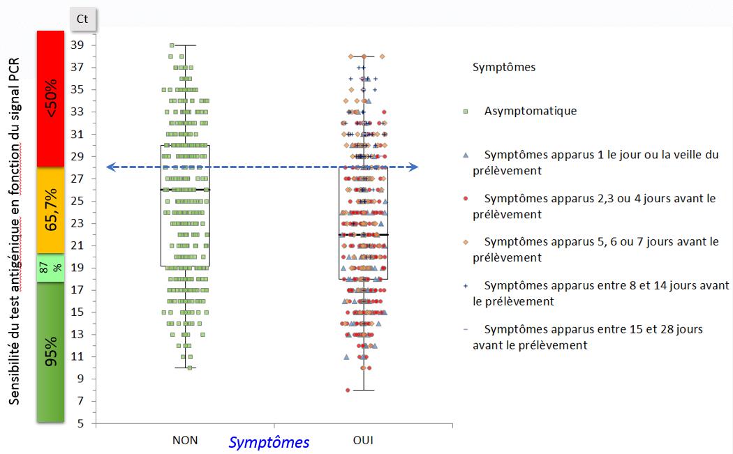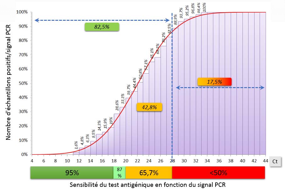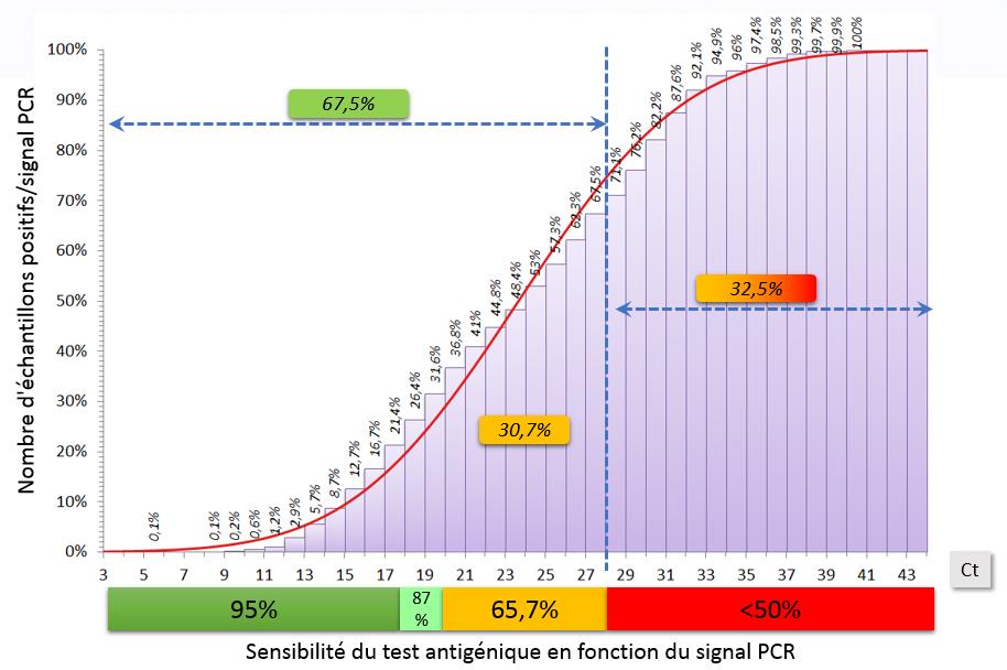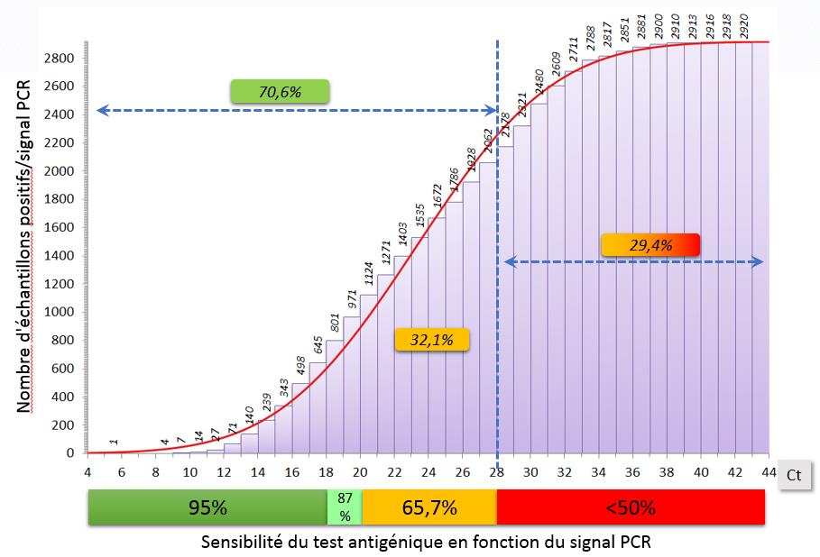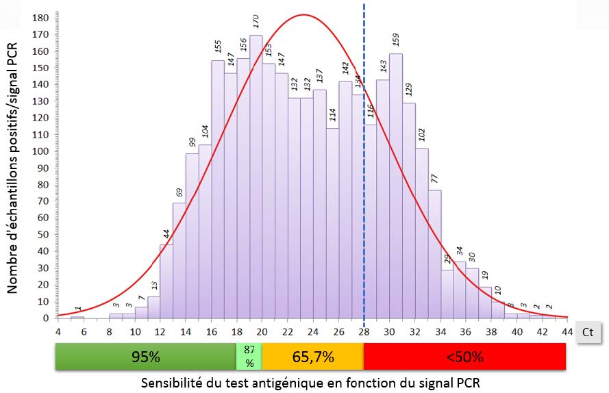 Etudier la distribution du signal RT-PCR (Ct) sur les échantillons détectés positifs pour le SARS-CoV-2. Analyser dans quelles proportions un test antigénique aurait rendu un résultat faussement négatif du fait d’un signal faible en PCR (Ct élevé).