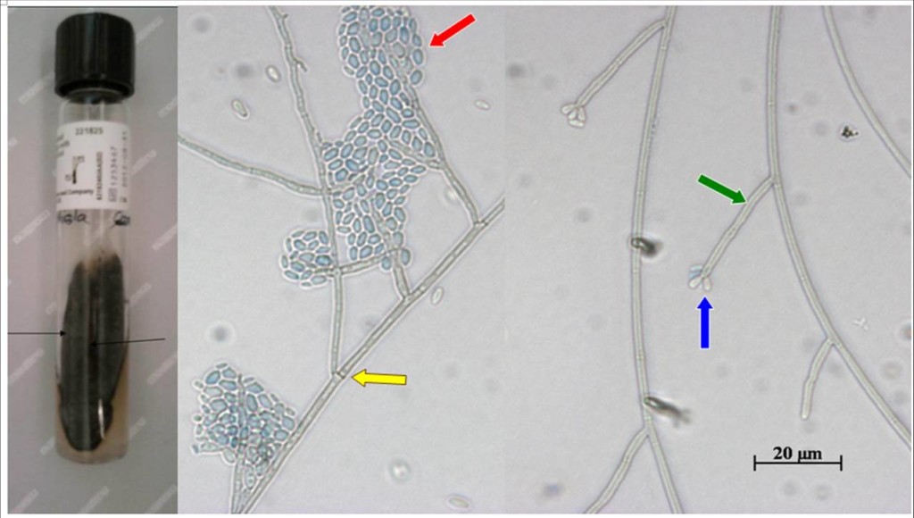 L’espèce Exophiala jeanselmei comprend quatre variants différents : E. jeanselmei var. heteromorpha, E. jeanselmei var. lecanii-corni, E. jeanselmei var. jeanselmei et E. jeanselmei var. castellanii (1). La croissance in vitro d’Exophiala jeanselmei est lente. Au recto, les colonies sont initialement lisses, gris verdâtre à noires, d’allure mucoïde et ressemblent à des colonies de levures foncées. Par la suite, elles se recouvrent de mycélium aérien qui forme un dôme duveteux (Figure 1). Le revers apparaît sombre, de couleur noire à olivacée. Le champignon pousse jusqu’à 37°C, mais pas à des températures supérieures ou égales à 40°C. À l’examen microscopique, de nombreuses cellules bourgeonnantes ellipsoïdales ressemblant à des levures sont généralement présentes, en particulier dans les cultures jeunes. Dispersées parmi ces éléments lévuriformes, se trouvent des cellules plus grosses, rondes ou ellipsoïdales. Elles sont issues de la transformation des filaments mycéliens, initialement cloisonnés et de diamètre fin et régulier, et qui progressivement se vésiculisent et se fragmentent avec production de courts filaments toruloïdes, dont les cellules ellipsoïdes se dissocient progressivement. Les filaments mycéliens, initialement brun clair, deviennent finalement bien foncés et ne portent pas de conidiophore multicellulaire. Les cellules conidiogènes apparaissent à l’extrémité des filaments mycéliens, ou sur leurs côtés ; elles sont alors insérées à angle droit. Ce sont de petites annélides cylindriques à extrémité effilée, mesurant 1 – 3 µm de long (Figure 1). A leur maturité, elles sont en forme de fusée, légèrement plus foncées que l’hyphe de soutien, avec, à leur apex, des zones annelées effilées qui apparaissent régulières. Les conidies produites sont unicellulaires (on parle alors d’amérospores), hyalines et lisses, à parois minces, ellipsoïdales, et mesurent en moyenne 3,8 x 1,7 µm ; leur cicatrice de libération est peu visible (Figure 1). Les conidies s’accumulent souvent au sommet des annélides, puis glissent le long de celles-ci. Exophiala oligosperma, E. nishimurae et E. xenobiotica sont des espèces très proches d’E. jeanselmei (1). Sans l’œil expérimenté du microscopiste ni le recours aux outils moléculaires, l’analyse morphologique est souvent insuffisante pour les distinguer les unes des autres (2,3). Le séquençage ADN des régions ITS (internal transribed spacers) ou du domaine D1/D2 de la grande sous-unité 28S de l’ARN ribosomal permet de proposer une identification formelle.