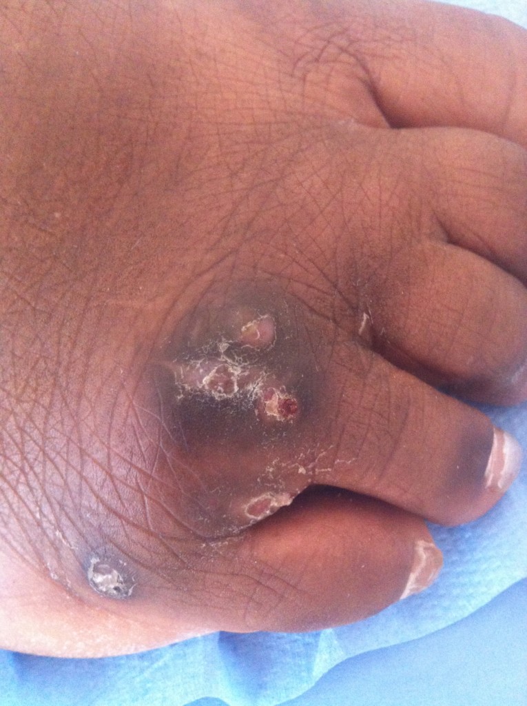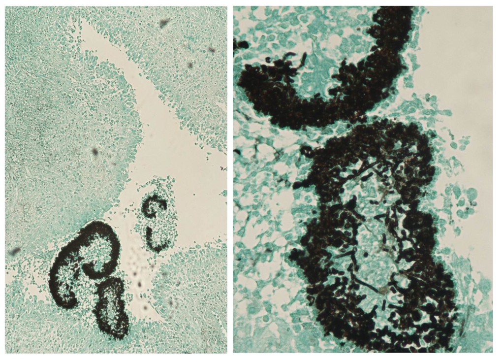 Exophiala jeanselmei est responsable de phaeohyphomycoses et de mycétomes (4), principalement dans la ceinture subsaharienne qui s’étale du Sénégal au Soudan, mais aussi en Inde (5,6). L’infection est majoritairement sous-cutanée. Elle résulte le plus souvent d’une implantation traumatique d’une épine ou d’une écharde qui sert de véhicule à l’organisme fongique. Le développement y est chronique et globalement asymptomatique au début du processus. En cas de phaeohyphomycose, le champignon se développe dans les tissus sous forme de filaments pigmentés libres. Un nodule ou un kyste finit par être visible, à l’œil nu ou à l’imagerie. Les mycétomes correspondent à la formation de grains fongiques, qui donnent plutôt des lésions bourgeonnantes et d’allure pseudo-tumorale des tissus mous (Figure 2), proche du point d’inoculation. Les grains caractéristiques des mycétomes peuvent sourdre de pertuis naturels ou être observés en laboratoire après biopsie (Figure 3). Des infections disséminées ont été rapportées chez des patients immunodéprimés, générant par exemple des endocardites ou des atteintes cérébrales. De très rares cas d’infections oculaires ou d’onychomycoses ont également été décrits chez des individus non immunodéprimés.