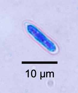 Les conidies sont produites dans des acervules, formés par un enchevêtrement de filaments mycéliens localisé dans le tissu végétal, sous l’épiderme. Au sein des acervules se différencient des conidiophores qui vont former un grand nombre de conidies. Sous la pression engendrée par la production des conidies, l’épiderme végétal cède ce qui permet leur libération. Pour C. lupini, les acervules matures visibles à la surface du végétal, apparaissent sous forme de masses orangées et gluantes (amas de conidies). La forme des conidies de C. lupini dont les thalles sur gélose Potatoe-Dextrose-Agar (PDA) sont illustrés par la figure 2, est caractéristique de celles du complexe C. acutatum, c’est-à-dire fusiforme avec une extrémité arrondie et l’autre légèrement pointue, et un aspect interne bi-gouttelé en microscopie optique (Figure 3). A notre connaissance, la forme sexuée de C. lupini n’a jamais été observée.