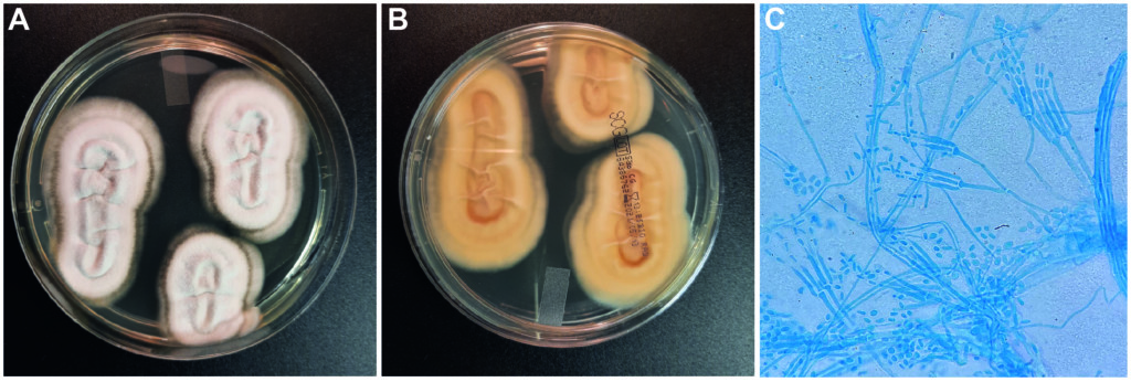 Les espèces du complexe R. argillacea sont phénotypiquement très proches. Elles présentent une croissance rapide, les colonies arrivant à maturité au bout de 3 à 5 jours à 37°C (espèces thermophiles). Celles-ci sont de couleur crème et présentent une surface veloutée à finement poudreuse (Figure 2A). Le verso est incolore (Figure 2B). Sur le plan microscopique, les champignons du genre Rasamsonia se caractérisent par des conidiophores fins et hyalins, d’aspect rugueux, qui portent à leur sommet des structures de type pénicilles mono-, bi- ou triverticillés (Figure 2C). Les phialides présentent un col effilé et donnent naissance à des spores unicellulaires disposées en chaînes basipètes. Les conidies sont habituellement cylindriques (plus rarement ellipsoïdales), ce qui constitue un critère majeur pour la différenciation avec d’autres champignons produisant des structures de type pénicilles. Cependant, l’identification précise des espèces du genre Rasamsonia reste difficile et ne peut être uniquement basée sur des critères morphologiques. L’essor de la spectrométrie de masse de type MALDI-TOF pour l’identification des champignons filamenteux aidera probablement à surmonter cette difficulté. En effet, certaines bases de données “maison” ou en ligne permettent désormais de distinguer les espèces au sein du complexe argillacea (ce qui est actuellement impossible avec les bases de données commercialisées qui ne comprennent pas les différentes espèces du genre Rasamsonia). Le séquençage des régions ITS, BenA et/ou Cmd peut également être mis à profit pour cette distinction. En outre, des techniques d’amplification des séquences répétitives de l’ADN permettent une caractérisation infra-spécifique des souches.