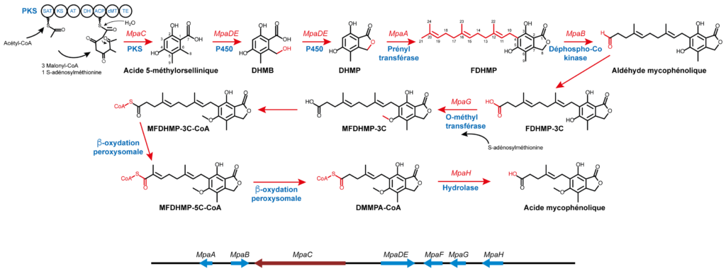 Penicillium brevicompactum produit différents métabolites, notamment de la brévianamide A, la brévicompanine C, les cyclodepsipeptides pétrosifungines A et B, de l’asperphénamate, et de la botryodiploidine, mais cette moisissure est surtout connue pour la production d’acide mycophénolique (MPA). La synthèse de ce dérivé de l’acide orsellinique (Figure 3) fait intervenir plusieurs enzymes, codées par différents gènes organisés en cluster, appelés mpa (pour mycophenolic acid). Ce cluster dont la composition a été défini par Regueira et al. [4] est centré sur le gène mpaC codant une polycétide synthase de type I partiellement réductrice, et comprend 6 autres gènes [4,5] :