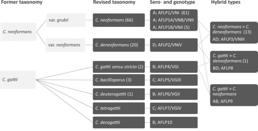 Le genre Cryptococcus comprend des levures rondes, encapsulées, de taille hétérogène pouvant aller de 5 µm à 7 µm de diamètre. La taille de la capsule est également variable (de 0,4 à 0,7 µm). Elle est composée de mannoprotéines et de deux polysaccharides, le glucuronoxylomannane et le galactoxylomannane. Sept espèces pathogènes pour l’homme sont aujourd’hui reconnues dans le genre Cryptococcus, réparties au sein de deux complexes d’espèces : le complexe Cryptococcus neoformans avec C. neoformans et C. deneoformans, et le complexe C. gattii qui comprend 5 espèces (C. gattii sensu stricto, C. bacillisporus, C. deuterogattii, C. tetragattii et C. decagattii). Il faut également signaler l’existence de 3 génotypes distincts pour l’espèce C. neoformans sensu stricto, et de 3 hybrides, ce qui représente un total de 12 génotypes (Figure 1).