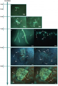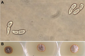 Diplocarpon rosae se caractérise par des spores bicellulaires (Figure 1A) et une grande variabilité macroscopique attestée par la grande diversité de taille et d’aspect des colonies obtenues pour différentes souches monosporées cultivées sur milieu malt-agar (Figure 1B). La croissance sur ce milieu est lente (plus de 15 jours pour obtenir un mycélium bien visible).
