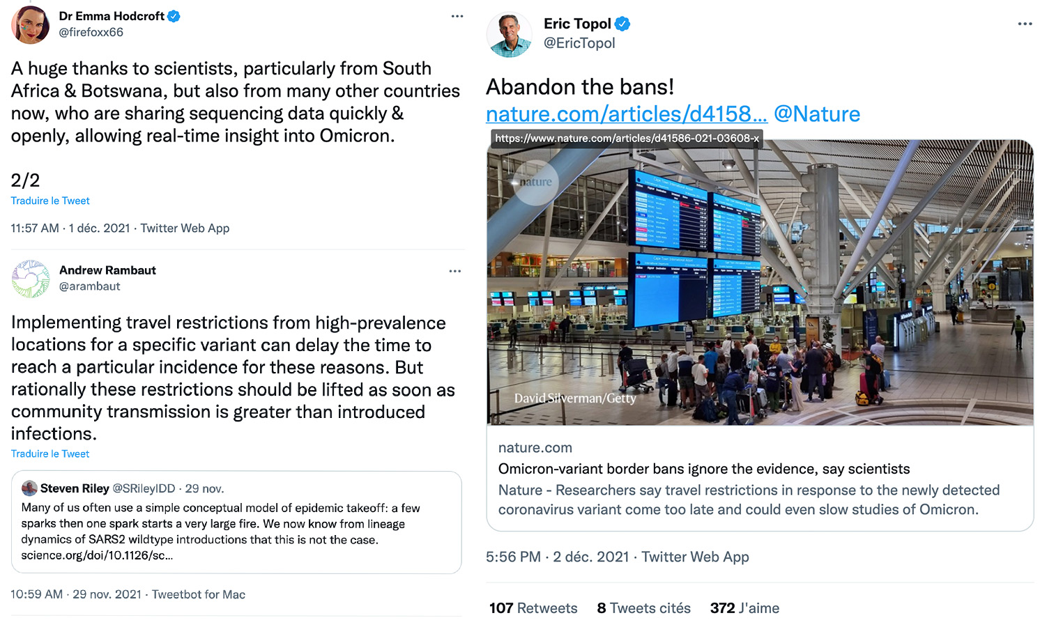 Par séquençage génomique des souches. Actuellement (au 1er décembre 2021), plus de 260 séquences du variant ont été rendues publiques, et ce chiffre augmente exponentiellement au fil des jours. Ces séquences permettent de cartographier les mutations du virus, de géolocaliser sa transmission et d’en comprendre la dynamique évolutive ainsi que de quantifier les paramètres de transmission et d’efficacité vaccinale. L’OMS souligne qu’il est essentiel d’améliorer les efforts de surveillance et de séquençage, ainsi que de rendre publiques les données génomiques et contextuelles, afin de mieux comprendre les variants circulants du SARS-CoV-2 de manière coordonnée au sein de la communauté internationale. L’Afrique du Sud a été félicitée de sa transparence lorsqu’elle a rapporté le nouveau variant (Hodcroft, Twitter), mais la réponse de nombreux autres pays de limiter les voyages depuis ce pays lanceur d’alerte apparaît comme une réponse largement inappropriée (Rambaut, Twitter). En effet, même si cela limite légèrement la diffusion, cela ne l’empêche pas, ou intervient trop tard, et d’autres mesures comme des aides à la vaccination ou la surveillance en Afrique du Sud pourraient être mises en place (Topol, Twitter).