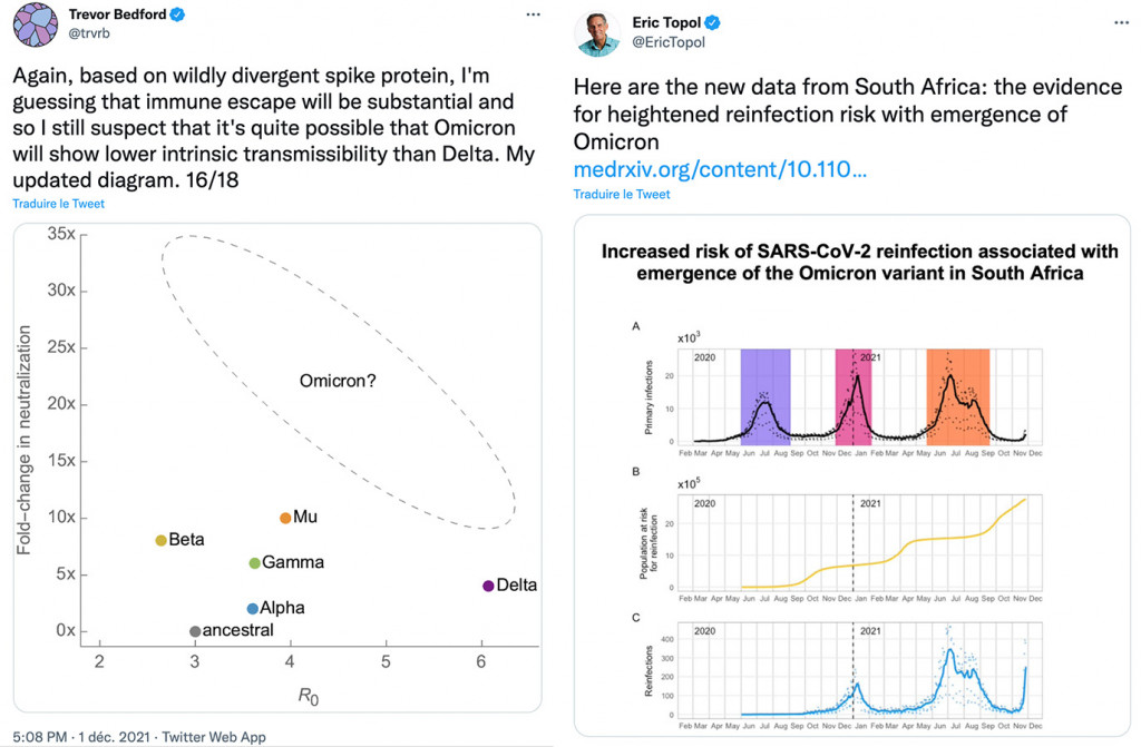 La diffusion rapide du variant Omicron dans la province du Gauteng en Afrique du Sud pourrait suggérer, mais ne signifie pas nécessairement, qu’il est plus transmissible que d’autres variants. Là aussi les données sont trop limitées. Il semble se répandre extrêmement rapidement dans les populations surveillées jusqu’à présent, qui sont restreintes en nombre et en taille. Mais il est difficile de dire si c’est dû à une caractéristique propre au virus (transmissibilité intrinsèque accrue) et/ou un effet de situation (événement “super-spreader” par exemple), à une couverture vaccinale faible, ou encore un échappement à l’immunité préexistante contre le SARS-CoV-2 (Bedford, Twitter). Cette dernière est fortement soupçonnée à cause de ses nombreuses mutations (Topol, Twitter).