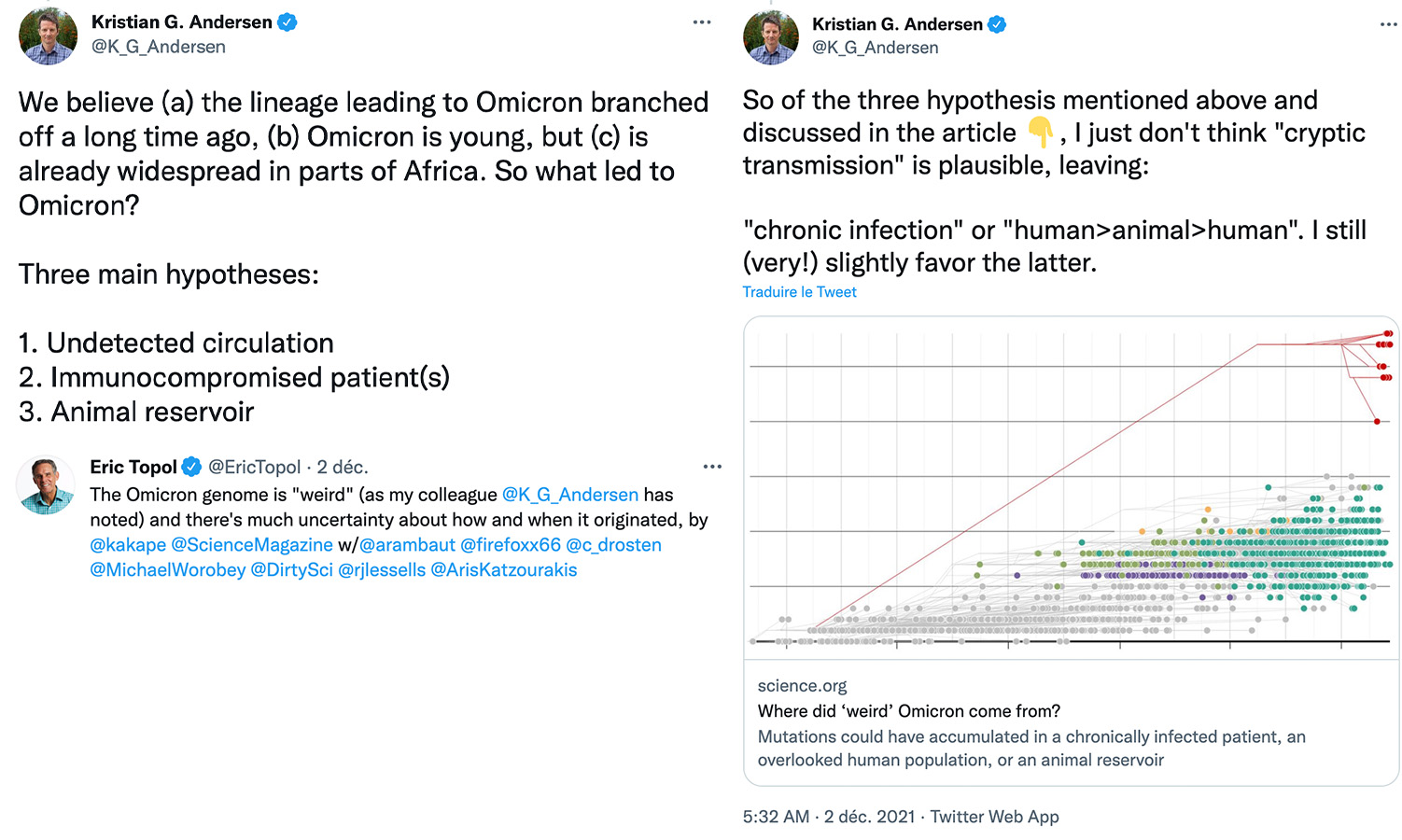 Trois hypothèses sont évoquées. D’abord, la possible circulation dans des populations humaines qui échappent à la surveillance génomique. Deuxièmement, une circulation chez l‘animal, contaminé par l’homme (zoonose inverse), puis repassage chez l’homme récemment. C’est une hypothèse avancée par le virologue Kristian Andersen (Twitter). Enfin, une infection chronique (de plusieurs mois) d’un patient chez lequel le virus aurait eu le temps de muter sans être détecté. Ces hypothèses sont discutées ici : Where did ‘weird’ Omicron come from?.
