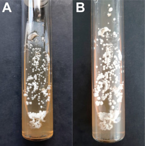 Le diagnostic biologique d’une onychomycose à A. nodosetosus est réputé difficile. L’examen direct après éclaircissement permet d’observer des filaments fins, septés et hyalins (Figure 1), parfois associés à des spores rondes ou en tonnelet. En culture, il présente une croissance très lente à 20-25°C, les colonies apparaissant au plus tôt 15 jours après l’ensemencement sur milieu de Sabouraud additionné ou non de cycloheximide. De petite taille, les colonies initialement blanchâtres, duveteuses et d’aspect neigeux (Figure 2A) s’incrustent progressivement dans la gélose (Figure 2B). En vieillissant, les colonies peuvent prendre une teinte brunâtre au recto, foncée au verso. Sur le plan microscopique, les cultures jeunes présentent des filaments fins, hyalins, sans fructification. Ce n’est que sur des cultures tardives (≥ 4 semaines) qu’apparaissent des chaînes d’arthrospores disposées à angle droit (Figure 3A). Celles-ci sont rondes à ovoïdes, avec parfois une cloison centrale (Figure 3B). En l’absence de sporulation, le séquençage des régions ITS des ADN ribosomaux peut être mis à profit pour l’identification. En revanche, la spectrométrie de masse MALDI-TOF ne permet pas d’identifier les champignons du genre Arachnomyces dont les spectres ne sont pas encore disponibles dans les bases de données en ligne.