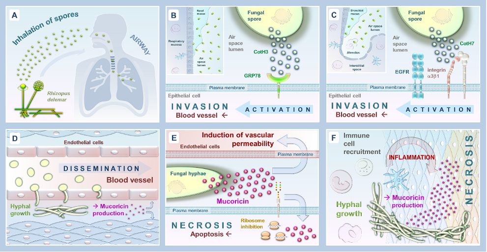 Cet article constitue une percée majeure dans la compréhension de la physiopathologie d’infections fongiques très dangereuses pour laquelle peu d’informations étaient jusqu’alors disponibles : les mucormycoses. Dans l’ensemble, Soliman et ses collègues fournissent un ensemble de données essentielles qui, combinées aux études précédentes, permettent désormais à la communauté de bénéficier d’un modèle plus complet décrivant la pathogenèse des mucormycoses (voir Figure). Ils proposent également des perspectives thérapeutiques innovantes ciblant cette toxine fongique pour enrayer la morbidité des mucormycoses, ouvrant ainsi de nouvelles opportunités pour développer des stratégies antifongiques ou immunothérapeutiques d’appoint contre d’autres infections fongiques à forte morbidité.