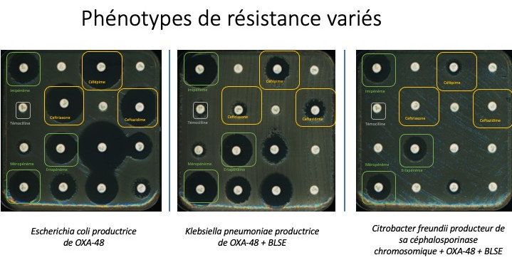 Le diagnostic de laboratoire de l’OXA-48 n’est pas toujours évident du fait de sa faible hydrolyse des carbapénèmes et l’absence de tests phénotypiques dédiés. Sur les plasmides de type IncL, le transposon Tn1999 s’insère au sein du gène tir, ce qui a pour effet de décupler les capacités conjugatives des plasmides et explique l’ampleur de la diffusion de l’OXA-48. Autres conséquences, les patients sont souvent porteurs au même moment de différentes espèces productrices d’OXA-48. Tous ces éléments concourent à une grande capacité épidémique de ce mécanisme de résistance. Aussi, la présence de plusieurs espèces productrices d’OXA-48 n’est que faussement rassurante et doit déclencher des explorations plus précises sur les liens épidémiologiques entre souches et plasmides, s’appuyant sur de nouvelles technologies de séquençage à haut débit, y compris de troisième génération (‘long read sequencing’).