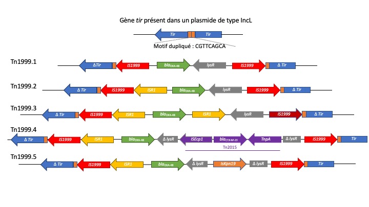 Ces données s’expliquent par les supports génomiques associés à l’OXA-48. Le gène de l’OXA-48 est inséré au sein du transposon Tn1999 dont il existe actuellement cinq formes variantes (Figure 2) (4). Dans sa forme la plus simple Tn1999.1, le transposon est composé de deux séquences d’insertion IS1999 en miroir qui entourent le gène blaOXA-48, un gène codant pour un régulateur transcriptionnel LysR, et un fragment d’un gène codant pour une acetyl coenzyme A carboxylase. Les transposons Tn1999.2 et Tn1999.3 portent en plus, tous les deux, une copie de la séquence d’insertion IS1R en amont du gène blaOXA-48 (Figure 2). Le Tn1999.3 aussi porte une seconde copie de l’IS1R située entre les gènes blaOXA-48 et lysR. La présence de la séquence d’insertion IS1R en amont du gène blaOXA-48 créé un promoteur fort responsable d’une activité enzymatique deux fois plus importante (Figure 2) (4). Les transposons Tn1999.4 et Tn1999.5 sont tous les deux des variants du Tn1999.2. Dans chacun d’entre eux, le gène lysR est tronqué par l’insertion du transposon Tn2015 porteur du gène de la BLSE blaCTX-M-15 (variant Tn1999.4) et la séquence d’insertion ISKpn19 (Tn1999.5) (Figure 2). Dans une étude portant sur plus de 100 souches productrices de OXA-48 isolées entre 2001 et 2011 en Europe et en Afrique du Nord, le Transposon Tn1999.2 était le variant le plus fréquemment retrouvé (78%) (10). Le motif génomique d’insertion reconnu par le Tn1999 consiste en une duplication d’un motif cible de neuf paires de bases : CGTTCAGCA présentes dans le gène tir, qui code pour protéine d’inhibition de transfert (15, 16). Des études de conjugaison ont démontré que l’interruption du gène tir par l’insertion du transposon Tn1999 engendre la synthèse d’une protéine non fonctionnelle et de ce fait, une augmentation de 50 à 100 fois le taux de transfert conjugatif du plasmide (16).