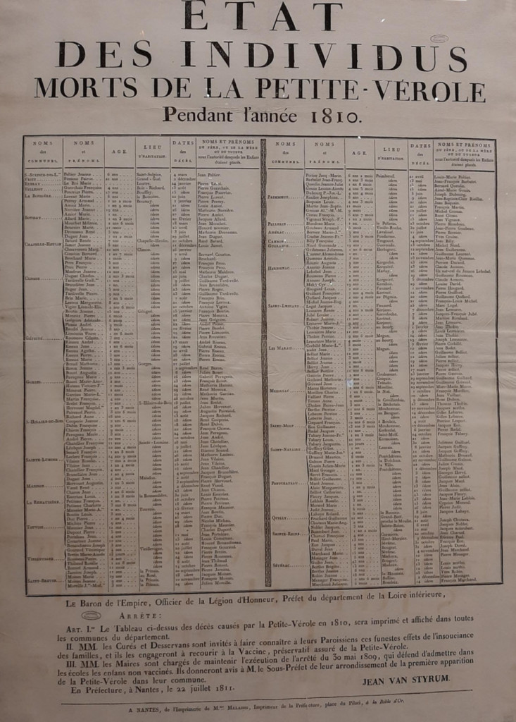 L’exposition donne à voir une étonnante affiche de l’époque napoléonienne. Y sont mentionnés, commune par commune, tous les morts de la « petite vérole » – la variole – en 1810 en Loire-Inférieure, l’actuelle Loire-Atlantique, avec leur âge et la date du décès. Sur les 188 victimes, 85 % ont moins de 20 ans et dans ce cas est cité le nom de leur père, mère ou tuteur.