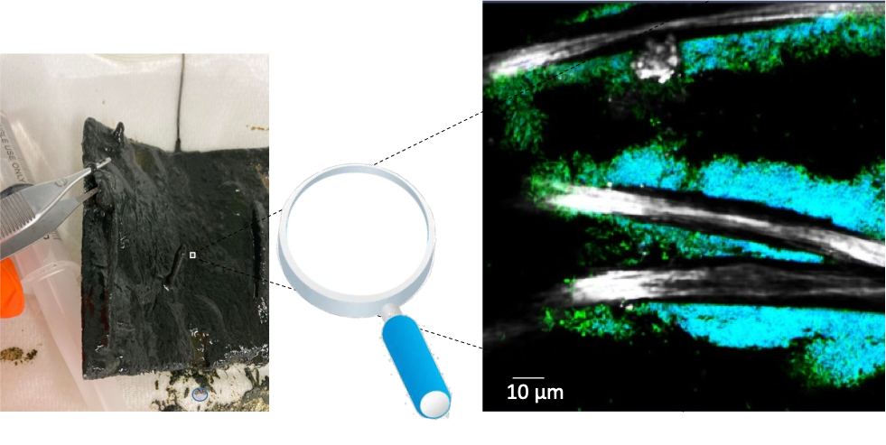 Le congrès Microbes 2022 à Montpellier a lui été l’occasion de découvrir une autre facette du métabolisme microbien. En effet, dans la nature, les microbes n’échangent pas seulement des électrons avec des molécules, mais aussi avec des surfaces ! C’est le cas par exemple de bactéries du genre Geobacter qui réduisent des précipités minéraux d’oxyde de fer ou de manganèse dans les sédiments [2]. Cette propriété métabolique a donné l’idée aux biotechnologues d’essayer d’interfacer ces microbes avec des électrodes, donnant naissance à de nouvelles technologies « électromicrobiennes » où des biofilms électroactifs sont exploités pour le traitement des eaux usées par exemple (Figure 1). La section biotech de la SFM a ainsi proposé une session spéciale dédiée à ces nouvelles technologies. Cette session a été l’occasion de découvrir les aspects fondamentaux des biofilms électro-actifs [3] aussi bien que diverses applications telles que le traitement d’effluents [4-6] ou la production de molécules à partir de CO2 et d’électrons [7].
