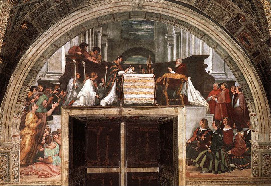Figure 2 : « La messe de Bolsena » dans la Stanza dell’Eliodor du palais apostolique du Vatican, peint par Raphaël entre 1511 et 1514 in : https://uploads4.wikiart.org/images/raphael/the-mass-of-bolsena-from-the-stanza-dell-eliodor-1514.jpg