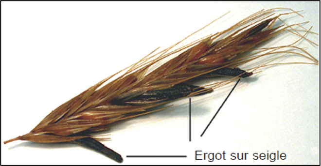 Claviceps purpurea (l’ergot du seigle) est un champignon qui a la capacité d’infecter diverses céréales, provoquant une maladie appelée l’ergotisme, nom dérivé du mot français « argot », qui signifie éperon. L’ergot, ou sclérote (Image 1) en langage scientifique définit comme une masse compacte de filaments fongiques, est produit par le champignon pour le protéger durant l’hiver, sur les épis de céréales à l’endroit où le grain devrait normalement se former. À l’intérieur des sclérotes, le champignon fabrique une grande variété de substances chimiques, les alcaloïdes, qui incluent l’ergotamine, l’ergosine et l’ergocristine, de puissants vasoconstricteurs qui sont à l’origine des symptômes violents observés chez les victimes de l’ergotisme.