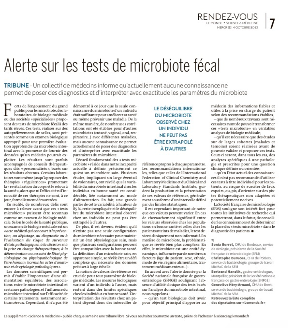 La Société Française de Microbiologie souligne son intérêt fort pour toutes les initiatives de recherche qui permettront, dans le futur, de consolider la place des « tests microbiote » dans le diagnostic des patients.