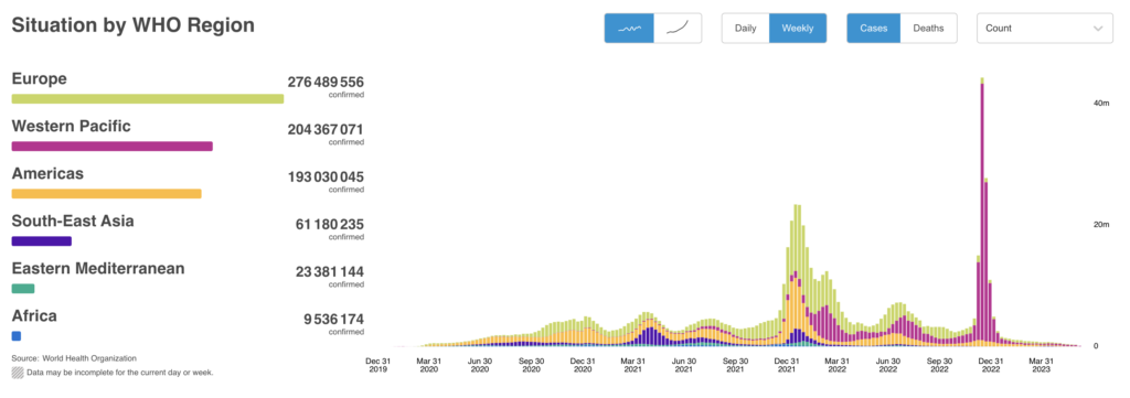 Cas dans le monde : 767 972 961 cas confirmés jusqu’au 12/072023 dont 275 747 929 en Europe
