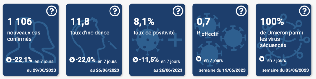 En semaine 21, les indicateurs virologiques (à partir des données SI-DEP) se stabilisaient dans un contexte de taux de dépistage très bas. Les passages aux urgences se sont également stabilisés et les nouvelles hospitalisations continuaient de baisser.